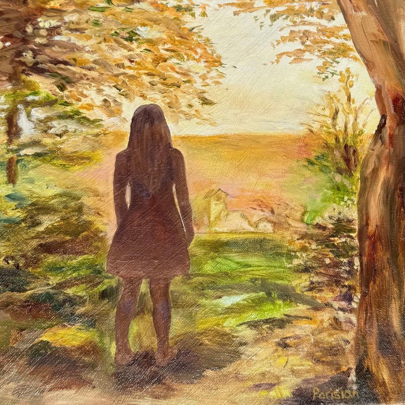 Inhaling to capacity, she closes her eyes. A broad smile emerges across her face when the euphoric scent of petrichor emanates from below. Upon exhalation, the spirited girl turns to face the warm sunlight. She opens her eyes, squints, and stares. Through an opening in the trees, in the distance, a dazzling sight astonishes her. She draws a quick breath. Amidst the glare, a quixotic scene, a portrayal, or perhaps an evocation becomes visible before her. The nebulous image awakens her. Enraptured by the golden glow she senses her life is but a dream.