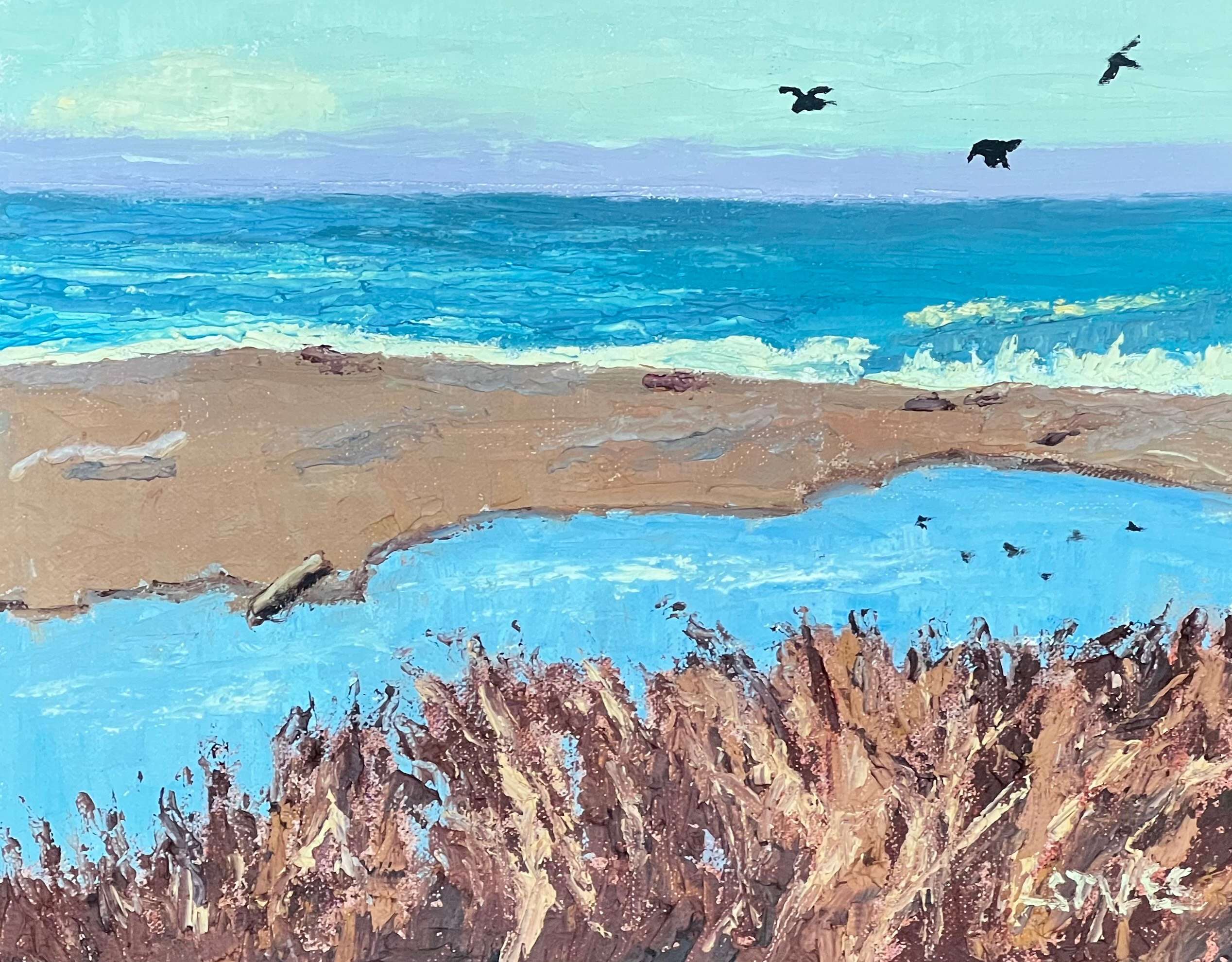 Artist Cindy Stiles moved to Cambria from the Central Valley where her artistic journey began in 2006 after retiring from elementary school teaching and many years of volunteering in the community. Her early art studies focused on stylized, color-saturated acrylic still lifes that can best be described as fun and funky. Before long however her interest transitioned to realism and she quickly enrolled in drawing and painting classes wherever she could find them. She also put away the acrylic paints in favor of her favorite medium, oil. Over the past several years she has studied seriously on her own and with master artists in workshops throughout the United States. She has exhibited her work at Cambria Center for the Arts and the Bakersfield Art Center and has been juried into a number of shows at the Bakersfield Museum of Art. Many of her paintings have found homes with collectors as far away as North Carolina, Hawaii, Missouri and Texas. While Cindy paints outdoors with the Cambria Wednesday Irregulars she draws inspiration from the California Impressionists, both living and historic. Her biggest cheerleaders are her husband David and her grown children Anne and John.